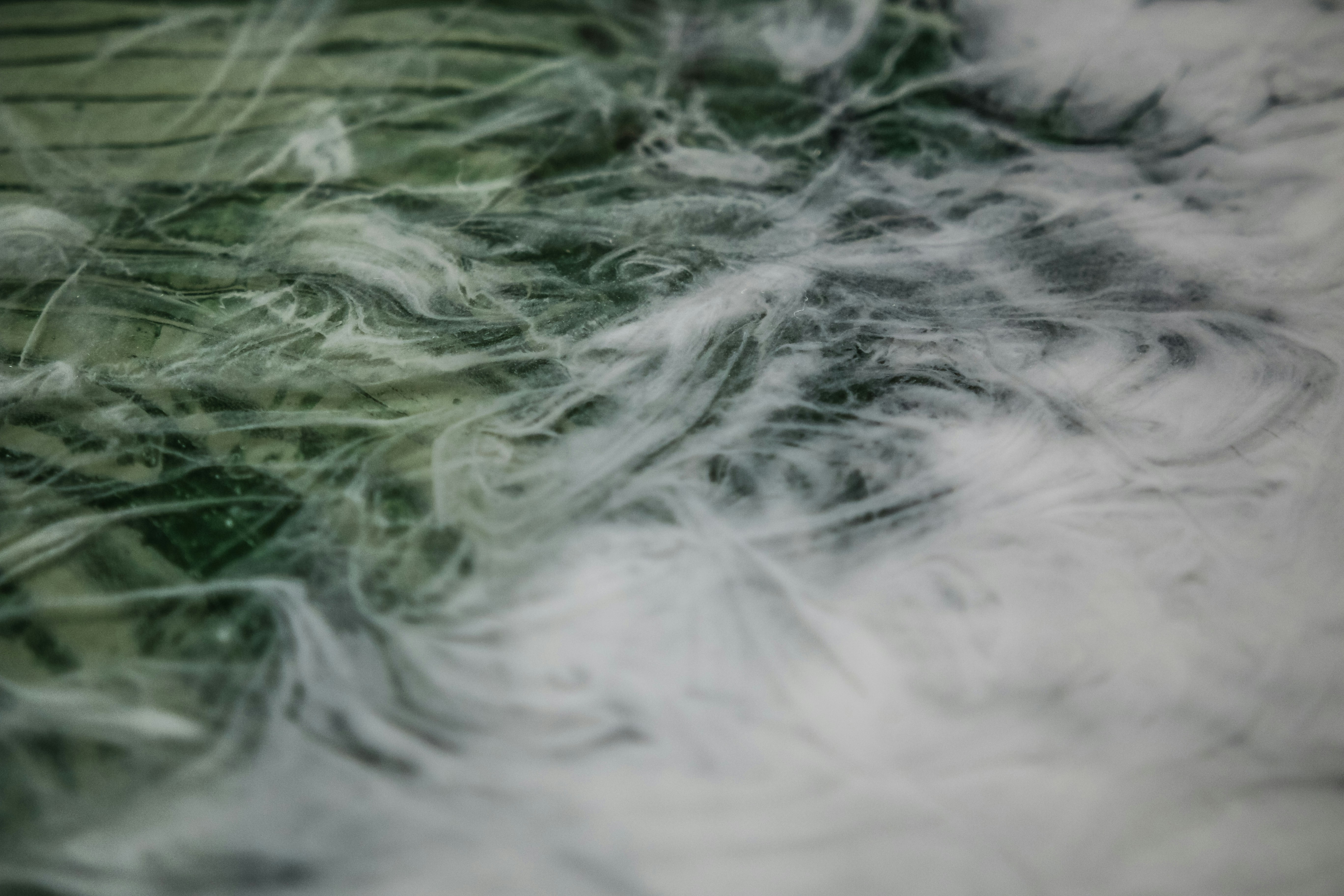 This experimental painting features green and black swirls beneath a few layers of clear and white epoxy resin.